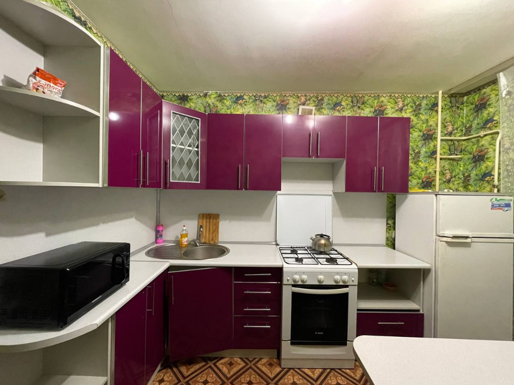 Кроме того, в нашей квартире вы найдете все необходимые предметы быта. Посуда различного назначения позволит вам готовить свои любимые блюда даже во время краткосрочного пребывания. Кухня оборудована всем необходимым — плитой, холодильником, микроволновой печью и чайником.